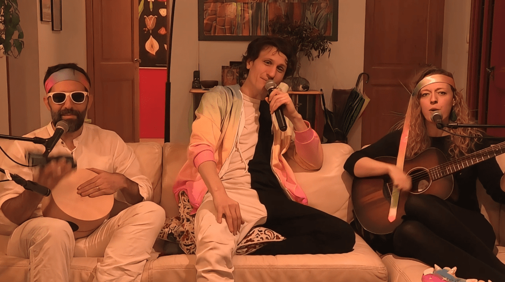 - En donnant d’emblée au public un rôle. Chaque spectateur.ice est un citoyen-ne résistant-e de la Z.E.D. On lui fournit un livret de citoyen, de petits drapeaux, des foulards multicolores, toute une panoplie “d’armes” pour s’engager ludiquement pendant le concert et au delà.